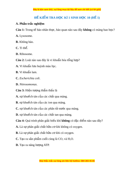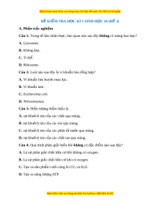 ĐỀ KIỂM TRA H C Ọ KÌ 1 SINH H C Ọ 10 (Đ 1 Ề ) A. Phần tr c nghi ắ m ệ