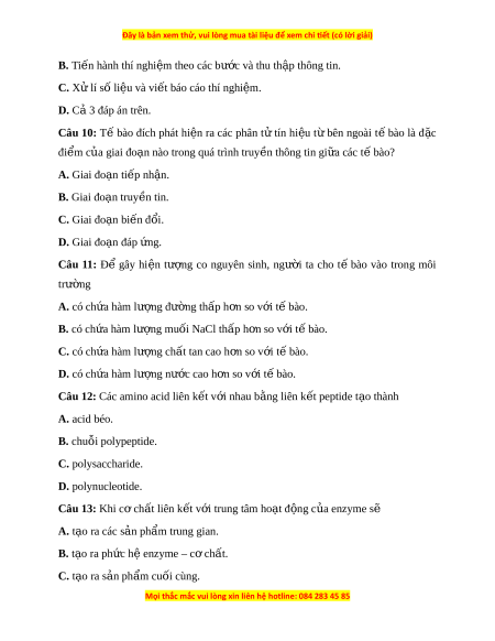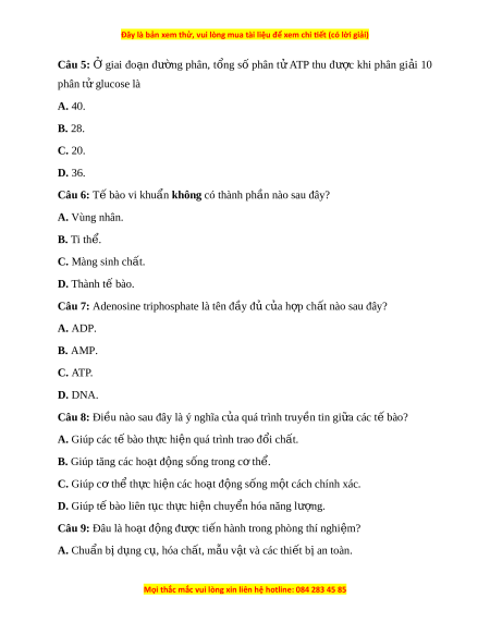 Câu 7: Adenosine triphosphate là tên đ y đ ầ c ủ a h ủ p ơ ch t ấ nào sau đây? A. ADP. B. AMP. C. ATP. D. DNA. Câu 8: Đi u nào s ê au đây là y nghia c a ủ quá trình truy n t ê in gi a các t ữ bào? ế A. Giup các t bào t ế h c hi ự n quá t ệ rình trao đ i ô ch t ấ . B. Giup tăng các ho t ạ đ ng s ô ng t ố rong c t ơ h . ể C. Giup cơ th t ể h c hi ự n các ho ệ t ạ đ ng s ô ng m ố t ô cách chính xác. D. Giup t bào ế liên t c t u h c hi ự n chuy ệ n hóa năng l ể ư ng. ơ Câu 9: Đâu là ho t ạ đ ng đ ô ư c t ơ i n hành ế trong phòng thí nghi m ệ ? A. Chuân bị d ng c u , u hóa ch t ấ , m u v ẫ t ậ và các thi t ế b an t ị oàn.