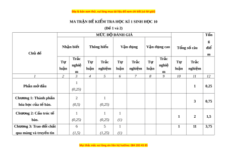 MA TRẬN ĐỀ KIỂM TRA H C Ọ KÌ 1 SINH H C Ọ 10 (Đề 1 và 2) M C Ứ Đ Đ Ộ ÁNH GIÁ T n ổ g Nhận bi t ế Thông hi u ể V n d ậ ng ụ Vận d ng cao ụ T ng s ổ ố câu điể Chủ đề m Trắc Trắc Tự Tự Trắc Tự Trắc Tự Tự Trắc nghiệ nghiệ luận luận nghi m ệ luận nghi m ệ luận luận nghi m ệ m m 1 2 3 4 5 6 7 8 9 10 11 12 1 Phần m đ ở ầu 1 0,25 (0,25) Chư ng 1: ơ Thành ph n ầ 2 1 3 0,75 hóa h c ọ c a t ủ bào. ế (0,5) (0,25) Chư ng ơ 2: C u t ấ rúc tế 1 1 1 1 2 1,5 bào. (0,25) (0,25) (1) Chư ng ơ 3: Trao đ i ổ ch t ấ 6 5 1 1 11 3,75 qua màng và truy n t ề in (1,5) (1,25) (1)
