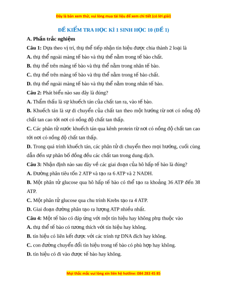 ĐỀ KIỂM TRA H C Ọ KÌ 1 SINH H C Ọ 10 (Đ 1 Ề ) A. Phần tr c nghi ắ m ệ Câu 1: D a t ư heo vi tri, th t u h t ê i p ê nh n t â in hi u đ ê ư c chi ơ a thanh 2 lo i a la A. th t u h ngoai ê mang t bao va t ê h t u h n ê m ă trong t bao ch ê t â . B. th t u h t ê rên mang t bao va t ê h t u h n ê m ă trong nhân t bao. ê C. th t u h t ê rên mang t bao va t ê h t u h n ê m ă trong t bao ch ê t â . D. th t u h ngoai ê mang t bao va t ê h t u h n ê m ă trong nhân t bao. ê