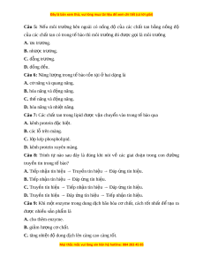 ử ucose qua chu trình Krebs t o r a a 4 ATP. D. Giai đo n a đư ng phân t ờ o a ra lư ng ơ ATP nhi u nh ề t â . Câu 4: M t ộ tê bao có đáp ng v ứ i ớ m t ộ tin hi u hay không ph ê t u hu c ộ vao A. th t u h t ê ê bao có tư ng t ơ hich v i ớ tin hi u hay không. ê B. tin hi u có ê liên k t ê đư c v ơ i ớ các trình t D ư NA đich hay không. C. con đư ng ờ chuy n đ ê ổi tin hi u t ê rong t bao có phù h ê p ơ hay không. D. tin hi u có đi ê vao đư c ơ t bao hay không. ê