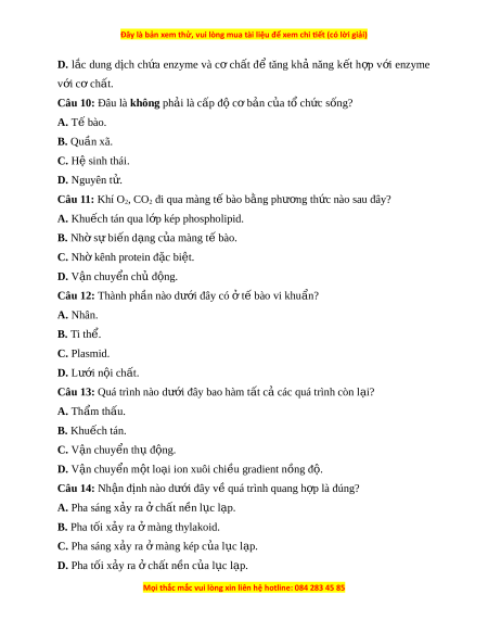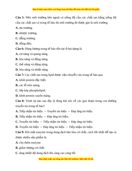 Câu 8: Trình tư nao sau đây la đúng khi nói về các giai đo n a trong con đư ng ờ truy n t ề in trong t bao? ê A. Ti p nh ê n t â in hi u → ê Truy n t ề in hi u → Đ ê áp ng t ứ in hi u. ê B. Ti p nh ê n â tin hi u → Đ ê áp ng t ứ in hi u ê . C. Truy n ề tin hi u ê → Ti p nh ê n t â in hi u ê → Đáp ng t ứ in hi u. ê D. Truy n ề tin hi u ê → Đáp ng t ứ in hi u ê → Ti p nh ê n t â in hi u. ê Câu 9: Khi m t ộ enzyme trong dung d ch i bão hòa c ơ ch t â , cách t t ố nh t â đ ê t o a ra đư c ơ nhi u s ề n ả ph m ẩ la A. cho thêm enzyme. B. gi m ả lư ng c ơ ơ ch t â . C. tăng nhi t ê đ dung d ộ ch l i ên cang cao cang t t ố .