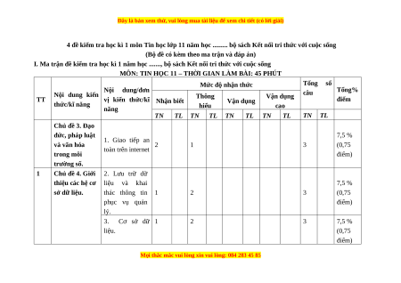 I. Ma trận đề kiểm tra học kì 1 năm học ......., bộ sách Kết nối tri thức với cuộc sống