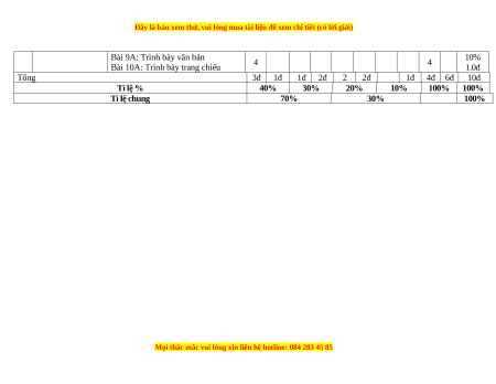 Bài 10A: Trình bày trang chiếu 1.0đ Tổng 3đ 1đ 1đ 2đ 2 2đ 1đ 4đ 6đ 10đ Tỉ lệ % 40% 30% 20% 10% 100% 100% Tỉ lệ chung 70% 30% 100%