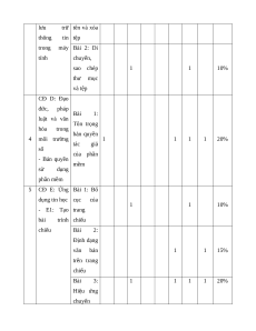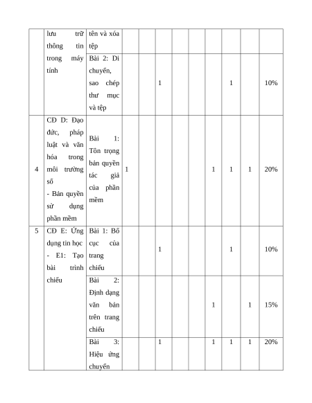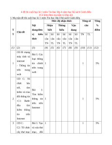 vị kiến Số Số Số Số Số Số TN TL thức câu câu câu câu câu câu TN TL TN TL TN TL (1) (2) (3) (4) (5) (6) (7) (8) (9) (10) (11) (12) CĐ B: mạng Bài 1: Các máy tính và loại thông internet 1 tin chính 1 1 5% - Thông tin trên trang trên trang web web CĐ C: Tổ chức lưu trữ, tìm Bài 1: kiếm và trao Tìm kiếm đổi thông tin 2 thông tin 1 1 5% -C1: Bước trên trên đầu tìm Internet kiếm thông tin trên Internet 3 CĐ C: Bài 1: Tạo 1 1 5% C2: Tổ chức và xóa thư cây thư mục mục, đổi lưu trữ tên và xóa thông tin tệp trong máy Bài 2: Di tính chuyển, sao chép 1 1 10% thư mục và tệp CĐ D: Đạo đức, pháp Bài 1: luật và văn Tôn trọng hóa trong bản quyền 4 môi trường 1 1 1 1 20% tác giả số của phần - Bản quyền mềm sử dụng phần mềm 5 CĐ E: Ứng Bài 1: Bố dụng tin học cục của 1 1 10% - E1: Tạo trang bài trình chiếu chiếu Bài 2: Định dạng văn bản 1 1 15% trên trang chiếu Bài 3: 1 1 1 1 20% Hiệu ứng chuyển trang chiếu CĐ E: Bài 1: - E2: Tập Làm quen soạn thảo với phần 6 1 1 10% văn bản mềm soạn thảo văn bản Tổng 4 0 4 0 1 3 8 3 100% Tỉ lệ % 40% 30% 30% 40% 60% Tỉ lệ chung 70% 30%