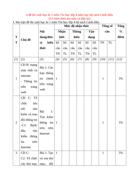 I. Ma trận đề thi cuối học kì 1 môn Tin học lớp 4 bộ sách Cánh diều
