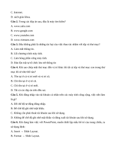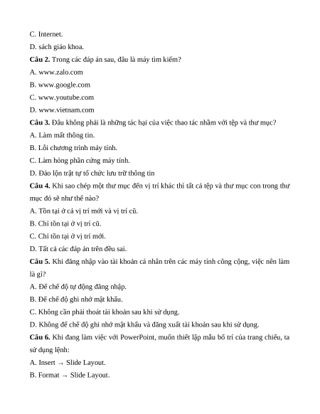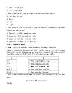 Câu 6. Khi đang làm việc với PowerPoint, muốn thiết lập mẫu bố trí của trang chiếu, ta sử dụng lệnh: A. Insert → Slide Layout. B. Format → Slide Layout.