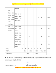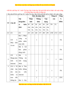 vị kiến Số Số Số Số Số Số TN TL thức câu câu câu câu câu câu TN TL TN TL TN TL (1) (2) (3) (4) (5) (6) (7) (8) (9) (10) (11) (12) Bài 1. Phần cứng và CĐ 1: 1 1 5% phần mềm Máy tính 1 máy tính và em Bài 2. Gõ bàn phím 1 1 5% đúng cách CĐ 2. Bài 3. Mạng máy Thông tin 2 1 1 20% tính và trên trang Internet Web 3 CĐ 3. Tổ Bài 4. Tìm chức lưu kiếm thông 1 1 5% trữ, tìm tin trên kiếm và Internet trao đổi 1 1 1 1 25% thông tin Bài 5. Cây
