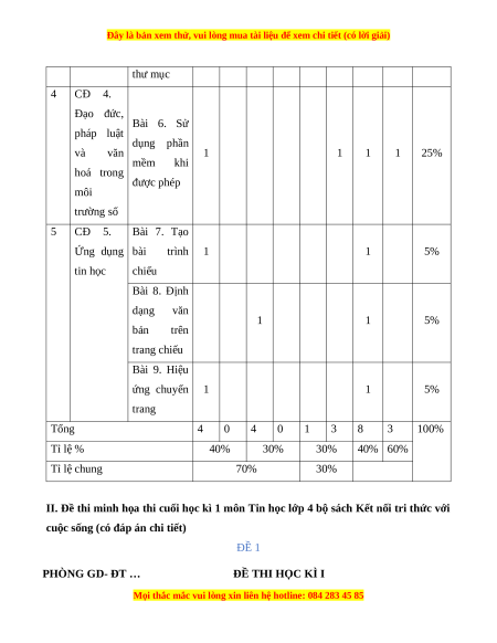 thư mục 4 CĐ 4. Đạo đức, Bài 6. Sử pháp luật dụng phần và văn 1 1 1 1 25% mềm khi hoá trong được phép môi trường số 5 CĐ 5. Bài 7. Tạo Ứng dụng bài trình 1 1 5% tin học chiếu Bài 8. Định dạng văn 1 1 5% bản trên trang chiếu Bài 9. Hiệu ứng chuyển 1 1 5% trang Tổng 4 0 4 0 1 3 8 3 100% Tỉ lệ % 40% 30% 30% 40% 60% Tỉ lệ chung 70% 30%