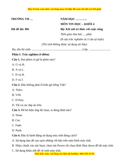 MÔN TIN HỌC – KHỐI 4 Mã đề thi: 001
