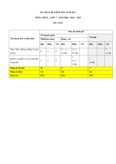 MÔN: GDCD – LỚP: 7– NĂM HỌC: 2024 – 2025 Đề 1 (CD) Mức độ đánh giá TN khách quan