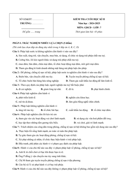 TRƯỜNG: …………. Năm học : 2024-2025 MÔN: GDCD - LỚP: 7 Đề gồm …. trang