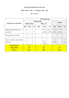 MÔN: GDCD – LỚP: 7– NĂM HỌC: 2024 – 2025 Đề 1 (CTST) Mức độ đánh giá TN khách quan
