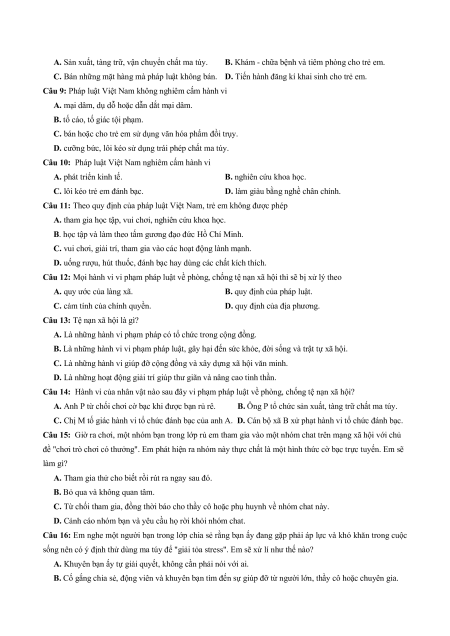 Câu 8 : Để phòng, chống tệ nạn xã hội, pháp luật Việt Nam nghiêm cấm hành vi nào sau đây?