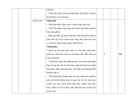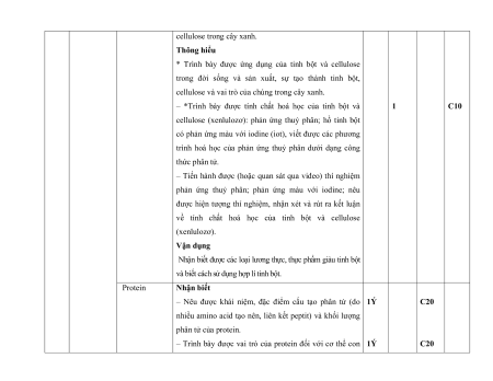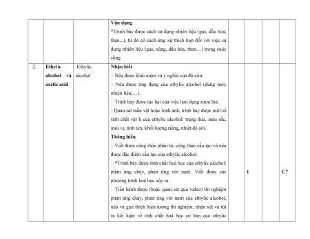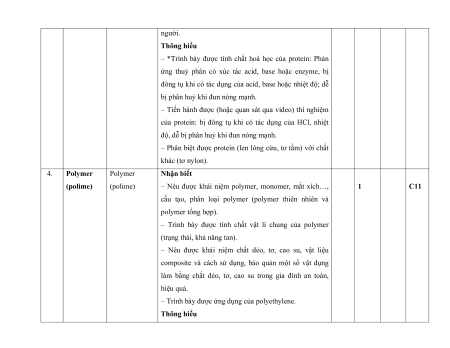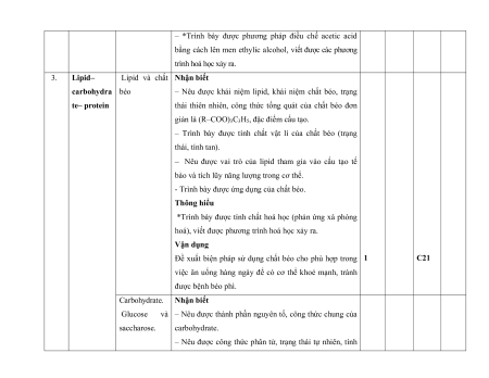 8. Ethylic alcohol và acetic 2 câu 2 0,5 acid 0,5đ 9. Lipid. Carbohydrate. 1 câu 1 câu 1 câu 1 câu 1 câu 3 2 3,5 Protein. Polymer 1,5 0,25đ 0,5đ 0,25đ 1đ