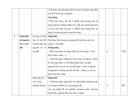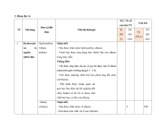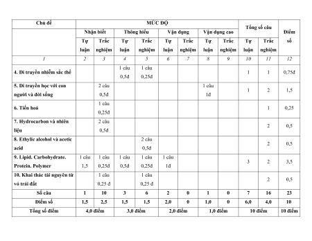 10. Khai thác tài nguyên từ 1 câu 1 câu 2 0,5 vỏ trái đất 0,25 đ 0,25 đ Số câu 1 10 3 6 2 0 1 0 7 16 23 Điểm số 1,5 2,5 1,5 1,5 2,0 0 1,0 0 6,0 4,0 10 Tổng số điểm 4,0 điểm 3,0 điểm 2,0 điểm 1,0 điểm 10 điểm 10 điểm 2. Bảng đặc tả Số ý TL/số Câu hỏi câu hỏi TN Đơn vi kiến TT Nội dung Mức độ đánh giá TL TN TN thức TL (Số (Số (Số (Số ý) ý) câu) câu) 1. Hydrocarb Hydrocarbon. Nhận biết on và Alkane