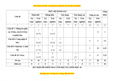 Chủ đề 9. Sinh học vi sinh 7 6 1 1 13 4,25 vật. (1,75) (1,5) (1) 5 4 1 Chủ đề 10. Virus. 1 9 3,25 (1,25) (1) (1) Số câu 0 16 0 12 2 0 1 0 3 28 10 Điểm số 0 4 0 3 2 0 1 0 3 7 10