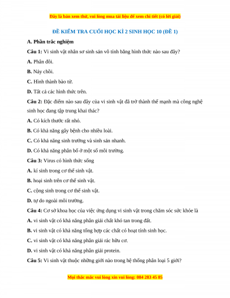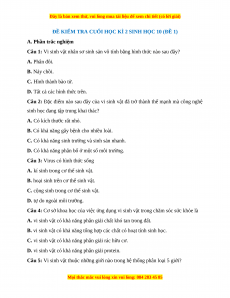 ĐỀ KIỂM TRA CUỐI HỌC KÌ 2 SINH HỌC 10 (ĐỀ 1)