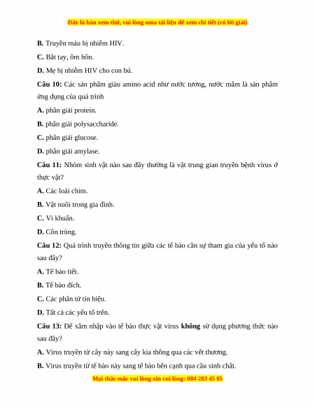 Câu 12: Quá trình truyền thông tin giữa các tế bào cần sự tham gia của yếu tố nào sau đây? A. Tế bào tiết. B. Tế bào đích.