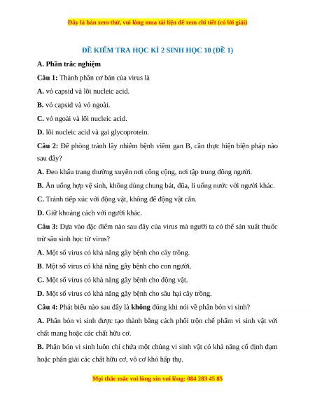 ĐỀ KIỂM TRA HỌC KÌ 2 SINH HỌC 10 (ĐỀ 1)
