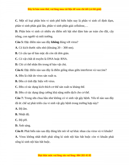 Câu 5: Đặc điểm nào sau đây không đúng với virus?