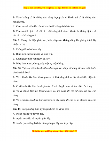 Câu 8: Phát biểu nào sau đây đúng khi nói về sự khác nhau của virus và vi khuẩn?