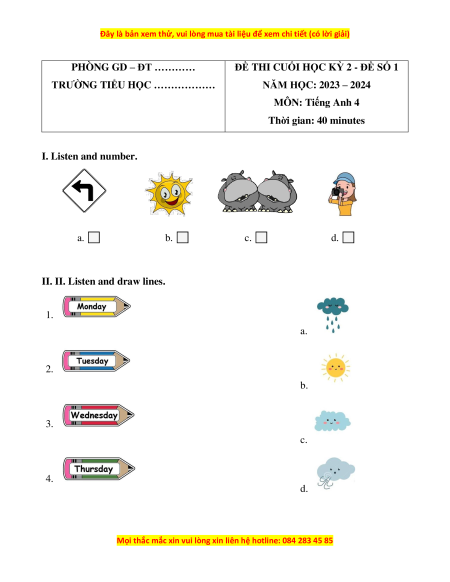 Thời gian: 40 minutes I. Listen and number. a. b. c. d.