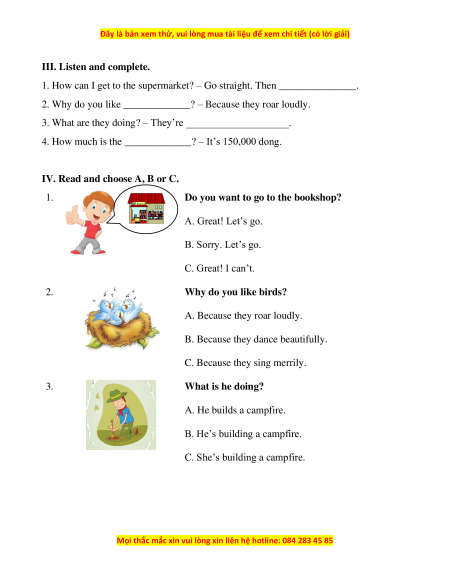 Do you want to go to the bookshop? A. Great! Let’s go. B. Sorry. Let’s go. C. Great! I can’t. 2. Why do you like birds? A. Because they roar loudly.