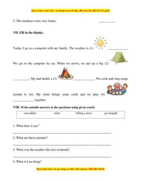 VIII. Write suitable answers to the questions using given words. crocodiles rainy telling a story go straight 1. What does it say?