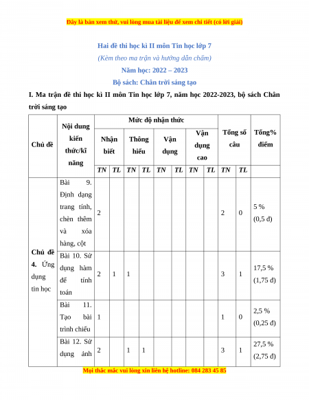 I. Ma trận đề thi học kì II môn Tin học lớp 7, năm học 2022-2023, bộ sách Chân trời sáng tạo