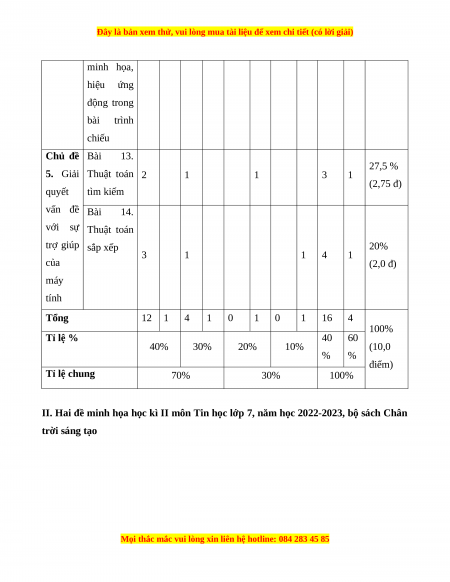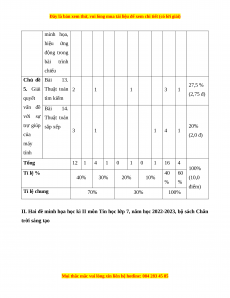 5. Giải Thuật toán 2 1 1 3 1 (2,75 đ) quyết tìm kiếm vấn đề Bài 14. với sự Thuật toán trợ giúp sắp xếp 20% 3 1 1 4 1 của (2,0 đ) máy tính Tổng 12 1 4 1 0 1 0 1 16 4 100% Tỉ lệ % 40 60 40% 30% 20% 10% (10,0 % % điểm) Tỉ lệ chung 70% 30% 100%