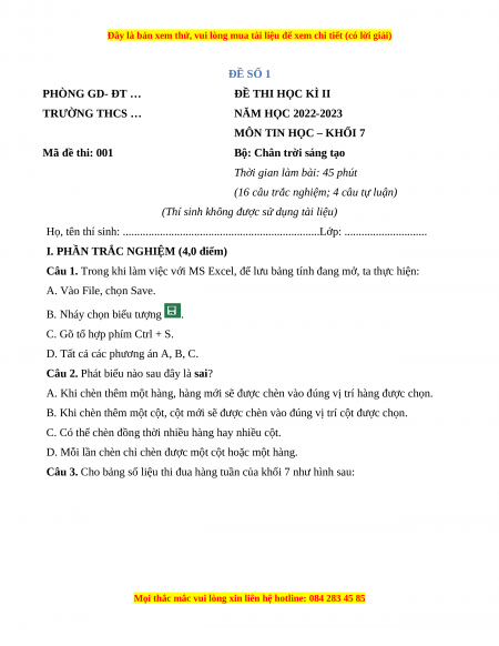 II. Hai đề minh họa học kì II môn Tin học lớp 7, năm học 2022-2023, bộ sách Chân trời sáng tạo