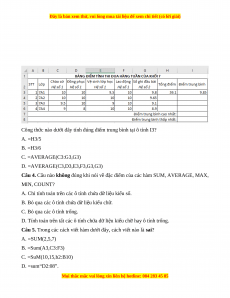 Câu 5. Trong các cách viết hàm dưới đây, cách viết nào là sai? A. =SUM(2,5,7) B. =Sum(A3,C3:F3) C. =SuM(10,15,b2:B10) D. =sum“D2:08”.
