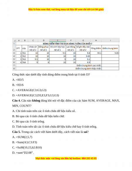 Công thức nào dưới đây tính đúng điểm trung bình tại ô tính I3? A. =H3/5 B. =H3/6 C. =AVERAGE(C3:G3,G3) D. =AVERAGE(C3,D3,E3,F3,G3,G3)