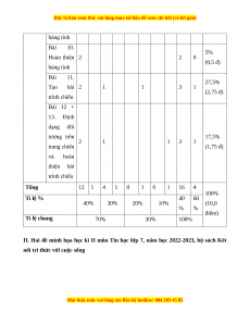 bảng tính Bài 10. 5% Hoàn thiện 2 2 0 (0,5 đ) bảng tính Bài 11. 27,5% Tạo bài 2 1 1 3 1 (2,75 đ) trình chiếu Bài 12 + 13. Định dạng đối tượng trên 17,5% 2 1 1 3 1 trang chiếu (1,75 đ) và hoàn thiện bài trình chiếu Tổng 12 1 4 1 0 1 0 1 16 4 100% Tỉ lệ % 40 60 40% 30% 20% 10% (10,0 % % điểm) Tỉ lệ chung 70% 30% 100%