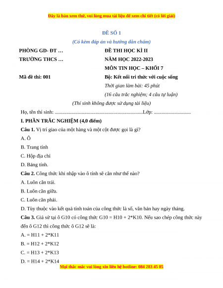 MÔN TIN HỌC – KHỐI 7 Mã đề thi: 001