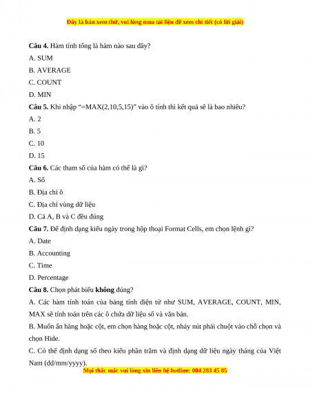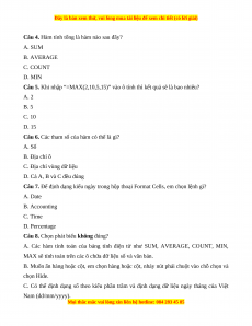 Câu 4. Hàm tính tổng là hàm nào sau đây? A. SUM B. AVERAGE C. COUNT D. MIN