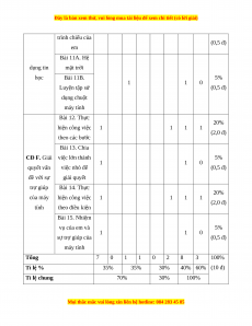 CĐ F. Giải việc lớn thành 5% 1 1 0 quyết vấn việc nhỏ để (0,5 đ) đề với sự giải quyết trợ giúp Bài 14. Thực 20% của máy hiện công việc 1 1 1 1 (2,0 đ) tính theo điều kiện Bài 15. Nhiệm vụ của em và 5% 1 1 0 sự trợ giúp của (0,5 đ) máy tính Tổng 7 0 1 1 0 2 8 3 100% Tỉ lệ % 35% 35% 30% 40% 60% (10 đ) Tỉ lệ chung 70% 30% 100%
