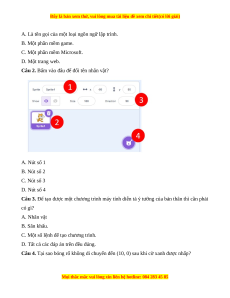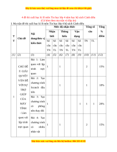 Số Số Số Số Số Số TN TL kiến thức câu câu câu câu câu câu TN TL TN TL TN TL (1) (2) (3) (4) (5) (6) (7) (8) (9) (10) (11) (12) Bài 1: Làm quen với lập CHỦ ĐỀ 1 1 2 15% trình trực F: GIẢI quan QUYẾT Bài 2: Tạo VẤN ĐỀ chương trình VỚI SỰ 1 1 10% Scratch đầu TRỢ tiên GIÚP 1 Bài 3: Tạo CỦA chương trình MÁY 1 1 1 1 20% có phông TÍNH nền thay đổi - Làm quen với Bài 4: Tạo lập trình chương trình 1 1 2 15% trực quan có nhiều nhân vật