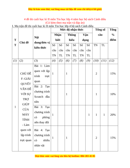 I. Ma trận đề thi cuối học kì II môn Tin học lớp 4 bộ sách Cánh diều