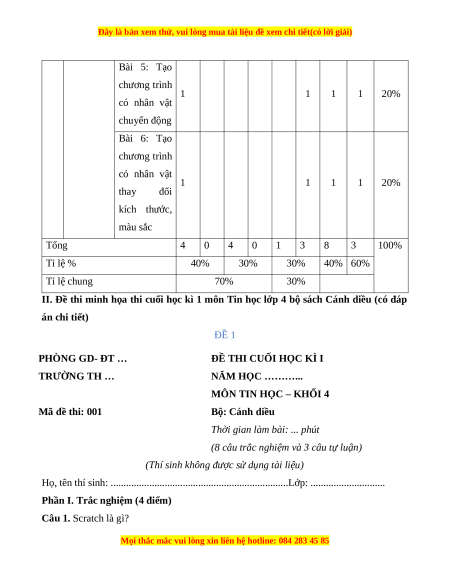 Bài 5: Tạo chương trình 1 1 1 1 20% có nhân vật chuyển động Bài 6: Tạo chương trình có nhân vật 1 1 1 1 20% thay đổi kích thước, màu sắc Tổng 4 0 4 0 1 3 8 3 100% Tỉ lệ % 40% 30% 30% 40% 60% Tỉ lệ chung 70% 30%
