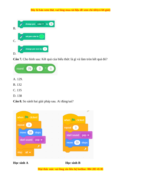 Câu 5. Nhóm lệnh....thay đổi kích thước, màu sắc của nhân vật. A. di chuyển. B. hiển thị. C. sự kiện. D. điều khiển.