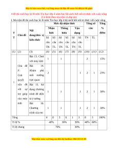Số Số Số Số Số Số TN TL kiến thức câu câu câu câu câu câu TN TL TN TL TN TL (1) (2) (3) (4) (5) (6) (7) (8) (9) (10) (11) (12) Bài 13. Chơi 1 1 2 15% với máy tính Chủ đề Bài 14. F: Khám phá 2 1 2 1 25% Giải môi trường quyết trực quan 1 vấn đề Bài 15. Sử với sự dụng chương 1 1 1 2 1 30%
