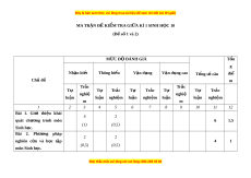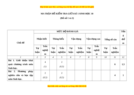 MA TRẬN ĐỀ KIỂM TRA GIỮA KÌ 1 SINH H C Ọ 10 (Đ s ề ố 1 và 2) M C Ứ Đ Đ Ộ ÁNH GIÁ T n ổ g Nhận bi t ế Thông hi u ể Vận d ng ụ Vận d ng cao ụ T ng s ổ ố câu điể Chủ đề m Trắc Trắc Tự Tự Trắc Tự Trắc Tự Tự Trắc nghiệ nghiệ luận luận nghi m ệ luận nghi m ệ luận luận nghi m ệ m m 1 2 3 4 5 6 7 8 9 10 11 12 Bài 1. Gi i ớ thi u ệ khái 4 2 quát chư ng ơ trình môn 6 1,5 (1) (0,5) Sinh h c. ọ Bài 2. Phư ng ơ pháp 2 2 nghiên c u ứ và h c ọ t p ậ 4 1 (0,5) (0,5) môn Sinh h c. ọ
