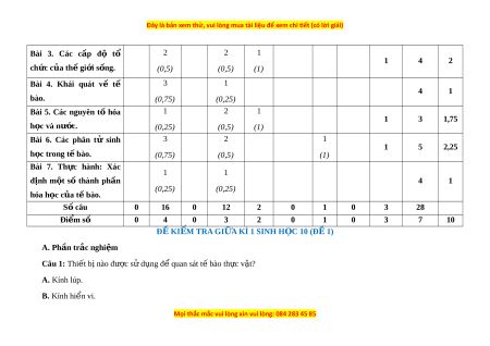Bài 6. Các phân tử sinh 3 2 1 1 5 2,25 h c ọ trong t bào. ế (0,75) (0,5) (1) Bài 7. Th c ự hành: Xác 1 1 đ nh ị m t ộ số thành ph n ầ 4 1 (0,25) (0,25) hóa h c ọ c a t ủ bào. ế S câu ố 0 16 0 12 2 0 1 0 3 28 Đi m ể số 0 4 0 3 2 0 1 0 3 7 10 ĐỀ KIỂM TRA GI A Ữ KÌ 1 SINH H C Ọ 10 (Đ 1 Ề ) A. Phần tr c nghi ắ m ệ Câu 1: Thi t ế bị nào đư c ợ s d ử ng ụ đ quan s ể át t bào t ế h c v ự t ậ ? A. Kính lúp. B. Kính hi n vi ể .
