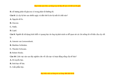 Câu 5: Các cấp độ tổ ch c ứ c a t ủ h gi ế i ớ sống là A. t p ậ h p t ợ ổ ch c nh ứ nh ỏ t ấ trong thế gi i ớ s ng. ố B. t p h ậ p t ợ ổ ch c ứ l n nh ớ ất trong th gi ế i ớ s ng. ố C. t p ậ h p t ợ ổ ch c l ứ n nh ớ ất và nh nh ỏ t ấ trong thế gi i ớ s ng. ố D. t p ậ h p t ợ t ấ c các ả c p t ấ ch ổ c ứ t nh ừ nh ỏ t ấ đ n l ế n nh ớ t ấ trong th gi ế i ớ s ng. ố Câu 6: H c t ọ huy t ế t bào ế không bao gồm n i ộ dung nào sau đây? A. T t ấ c m ả i ọ v t ậ đ u đ ề ư c c ợ u t ấ o ạ t t ừ bào. ế B. Các t bào l ế à đ n v ơ c ị a c ủ ơ th s ể ng. ố C. Các t bào đ ế ư c ợ sinh ra t các ừ t bào t ế rư c ớ đó b ng cách ằ phân chia t bào. ế D. Ho t ạ đ ng s ộ ống c a ủ t bào l ế à sự phối h p ợ c a các ủ bào quan trong t bào. ế
