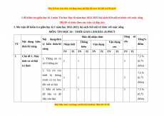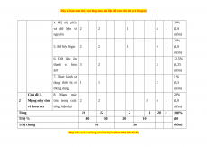 vị kiến thức/kĩ Nhận biết Vận dụng điểm thức/kĩ năng hiểu cao năng TN TL TN TL TN TL TN TL TN TL 1 Chủ đề 1. Máy 7,5 % 1. Thông tin và tính và xã hội 2 1 3 (0,75 xử lí thông tin tri thức điểm) 2. Vai trò của 7,5 % thiết bị thông 2 1 3 (0,75 minh và tin học điểm) đối với xã hội 3. Một số kiểu 2 1 3 7,5 % dữ liệu và dữ (0,75 liệu văn bản điểm)