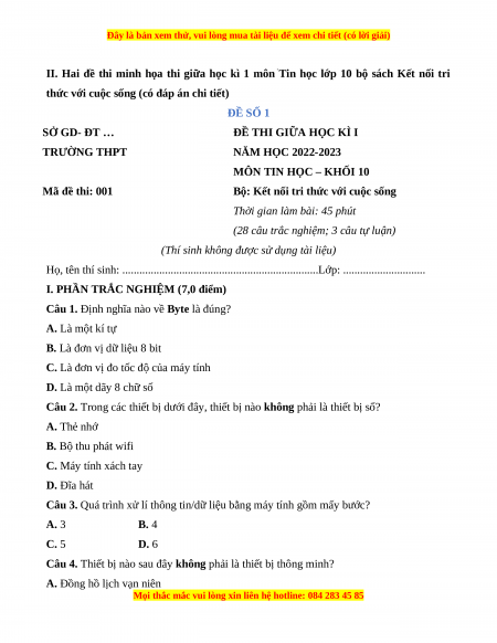 II. Hai đề thi minh họa thi giữa học kì 1 môn Tin học lớp 10 bộ sách Kết nối tri