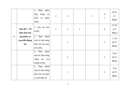 trao đổi thông một số tính năng 1 3 (0,75 tin hữu ích của máy điểm) tìm kiếm. 3. Thực hành 7,5% một số tính năng 2 3 (0,75 nâng cao của điểm) mạng xã hội. 4. Thực hành 7,5% một số tính năng 1 3 (0,75 hữu ích của dịch điểm) vụ thư điện tử. 2 Tổng 16 12 1 1 28 Tỉ lệ % 40 30 20 10 10 Tỉ lệ chung 70 30 100 3