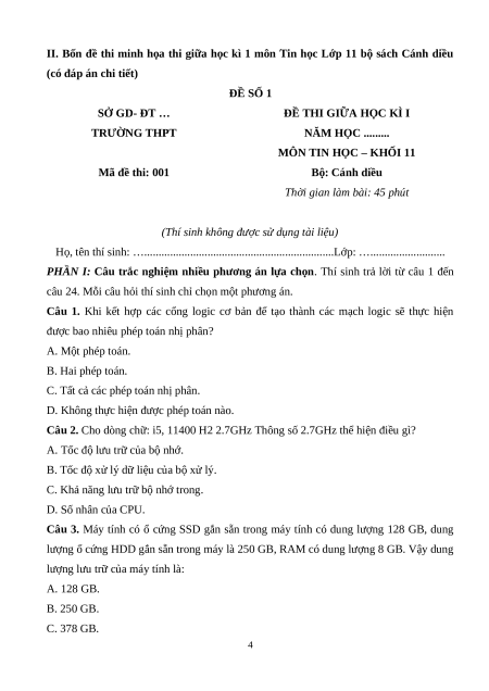 4 đề kiểm tra giữa học kì I môn Tin học Lớp 11 năm học .......... bộ sách Cánh Diều